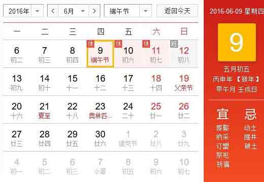 一、2016年端午节假期共3天,6月9日至11日放假调休。其中,6月9日(星期四、农历端午当日)为法定节假日,共3天。6月12日(星期日)上班。