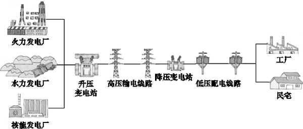 电能从发电厂制造出来,通过变电升压,进入高压输电线路,再经过变电降压,配电给各个用户。